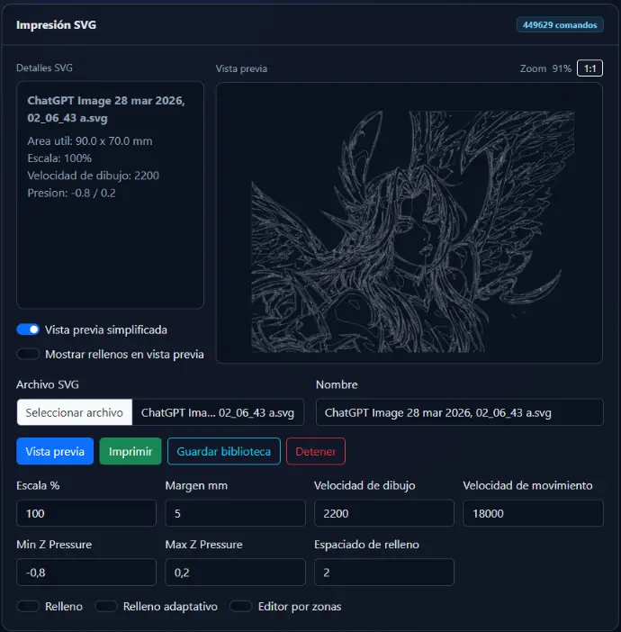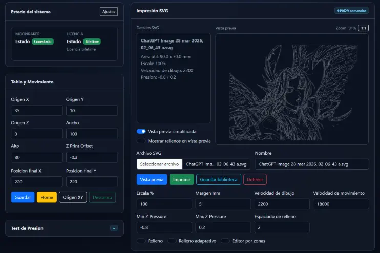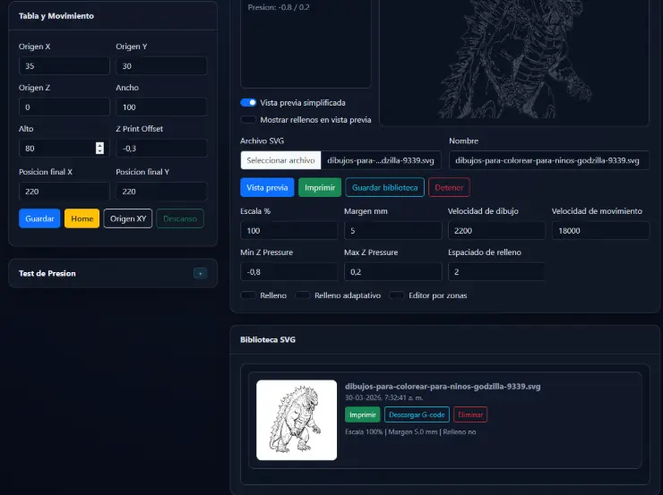 Draw3D! es una aplicación profesional para convertir diseños SVG en trazos físicos sobre una máquina controlada por Klipper, de forma simple, visual y lista para producción. Permite cargar archivos SVG, previsualizar el recorrido, ajustar escala, márgenes, velocidades y presión de dibujo, y enviar el trabajo directamente a la máquina o como archivo G-code según el flujo que necesite el usuario.