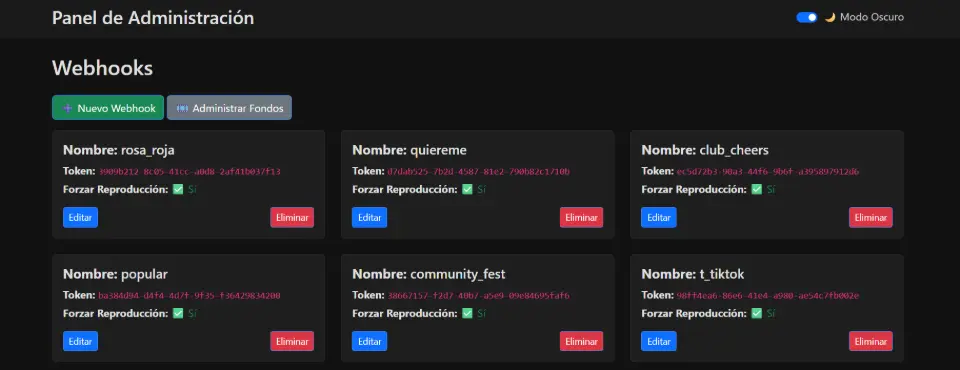 Administración de webhooks. una de las ventajas es la capacitad de disparar animaciones especificas para diferentes eventos en modalidad json. simplemente enviando el disparador como enlace de petición.