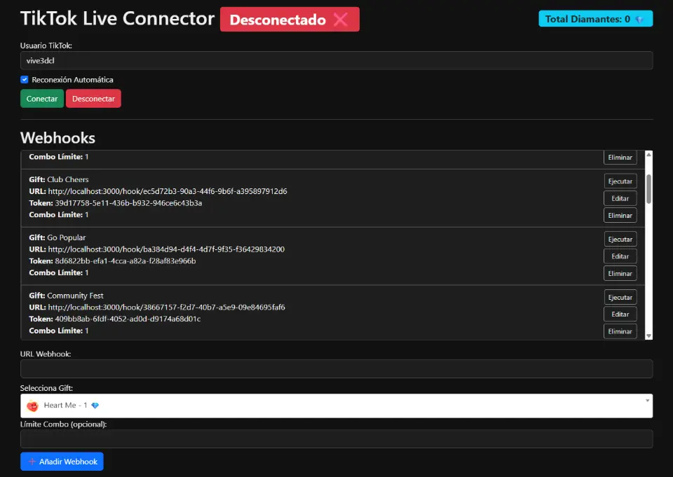 3) Servidor de conexión. El servidor de conexión es el encargado de tomar interaccionen en transmisiones en vivo y convertirlas en llamados a webhook para ejecutar las animaciones especificas para cada interacción en el servidor de transmisión. de momento el soporte esta apuntado a la red social tiktok pero se esta trabajando para integrarlo a twich, Instagram y YouTube.