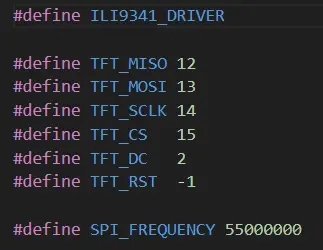c) Cargar parámetros y pines de conexión. dependiendo de cada pantalla a utilizar los pines de conexión pueden variar se deben buscar los datos en la documentación de tu dispositivo para configurar todo correctamente. en este ejemplo dejamos la configuración estándar para la pantalla TFT Yellow ESP32-2432S028. modifica los valores en el archivo User_Setup.h dentro de la carpeta del plugin TFT_eSPI en el directorio de librerías ubicado en /documentos/arduino.