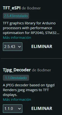 b) Instalación de librerías. Para el correcto funcionamiento de la pantalla a la hora de dibujar las imágenes, en Arduino IDE se deben instalar las librerías listadas abajo. además del soporte para el modulo ESP32.